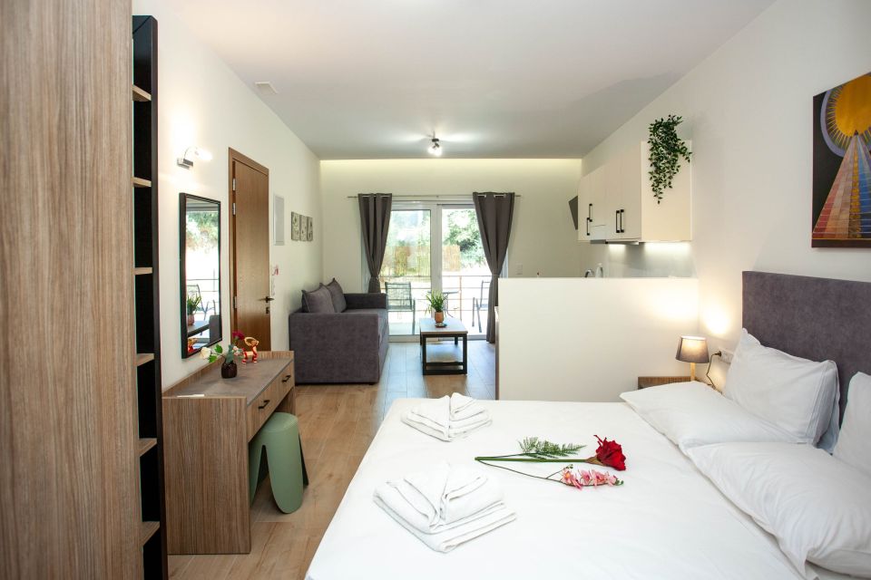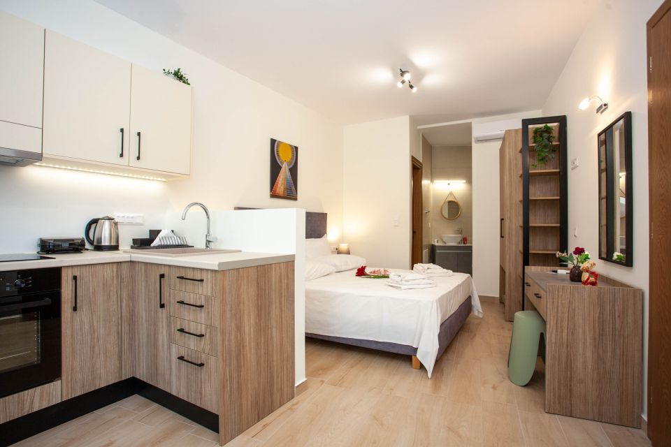 Τα στούντιο στον πρώτο όροφο είναι ιδανικά για μικρές οικογένειες, παρέες τριών ατόμων και ζευγάρια. Είναι πλήρως ανακαινισμένα και διαθέτουν μικρή κουζίνα εξοπλισμένη με βασικά σκεύη, και άνετο χώρο για ύπνο.